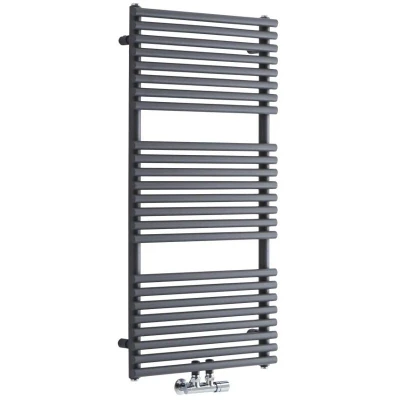 General description Keep your towels tidy and perfectly warmed with the modern Milano Via middle connection bar on bar heated towel rail. Made from premium quality steel, it features a contemporary anthracite powder-coated finish. With an impressive heat output, your towels will always feel cozy and ready for use. Technical specifications Dimensions: 1065mm x 500mm x 58mm Heat output: 867 BTUs / 254 Watts (T50); 404 BTUs / 118 Watts (T30) Construction material: Steel Finish: Anthracite powder-coated Tested and certified to BS EN 442 standard Manufacturer: ISO9001:2015 registered Compatibility and accessories Requires radiator valves (not included) Other information Includes blanking and bleed plug plus fixings This product is covered for 10 years