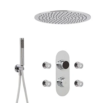 AmazonConcealed digital thermostatic shower control with ceiling-mounted 400mm round recessed rainfall shower head, hand shower kit and four round body jets with swivel joints Stainless steel and solid brass construction with chrome finish and ceramic disc technology to prevent drips Push button on/off operation and simple control with colour-changing temperature indication Compatible with all types of plumbing system A recessed area is required in the wall or ceiling to fit the digital control box, Weight: 20.6793601756 pounds, Manufacturer: Milano