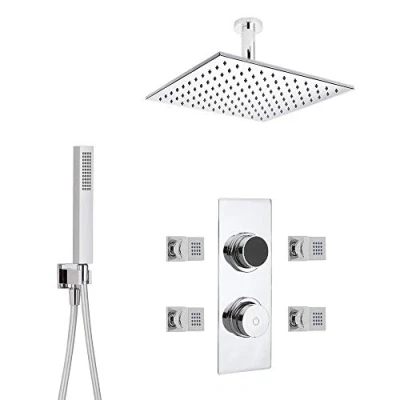 AmazonConcealed digital thermostatic shower control with ceiling-mounted 300mm square rainfall shower head, hand shower kit and four square body jets with swivel joints Stainless steel and solid brass construction with chrome finish and ceramic disc technology to prevent drips Push button on/off operation and simple control with colour-changing temperature indication Compatible with all types of plumbing system A recessed area is required in the wall or ceiling to fit the digital control box, Weight: 17.8794894482 pounds, Manufacturer: Milano