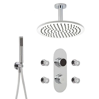 AmazonConcealed digital thermostatic shower control with ceiling-mounted 300mm round rainfall shower head, hand shower kit and four round body jets with swivel joints Stainless steel and solid brass construction with chrome finish and ceramic disc technology to prevent drips Push button on/off operation and simple control with colour-changing temperature indication Compatible with all types of plumbing system A recessed area is required in the wall or ceiling to fit the digital control box, Weight: 16.6008083286 pounds, Manufacturer: Milano