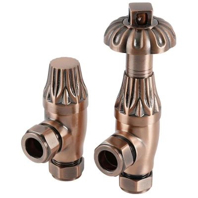 General description Enhance the elegant look of your traditional radiator or heated towel rail with the antique style Milano Windsor thermostatic angled radiator valves. Featuring a classic design with a timeless antique copper finish, the pair of valves are made from premium quality solid brass and toughened ABS. The integral thermostatic control allows you to easily adjust the temperature to create the perfect warmth in your living space. Technical specifications Material: Solid brass and toughened ABS Finish: Antique copper Thread connection: Standard 1/2" for use with 15mm pipes Frost protection: Activates when temperature drops below 7°C Warranty: Covered for 5 years Installation Easy installation with standard 1/2" thread connection Not bi-directional; install the TRV thermostatic head at the flow side and the lockshield at the return side Usage Suitable for use with a radiator or heated towel rail Refer to the manual for instructions on completely shutting off the valve