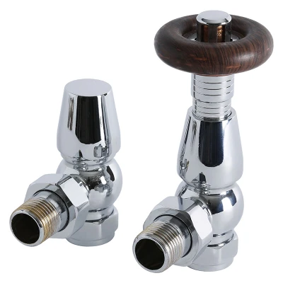 General description Enhance the classic style of your traditional heated towel rail or radiator with this pair of Milano Windsor angled thermostatic radiator valves, which feature a timeless chrome finish and a wood effect ABS handle. Technical specifications Material: Solid brass Thread size: 1/2" Dimensions: 78.5mm x 55mm x 130mm Frost protection: Below 7°C Compatibility and accessories Suitable for use with a radiator or heated towel rail Incorporates standard 1/2" threads and 15mm compression fittings Installation Valves are not bi-directional; install the TRV thermostatic head at the flow side and the lockshield at the return side. Usage Offers accurate control of the temperature in your room, creating a cozy environment and helping to reduce energy consumption. Other information This product is covered for 5 years.