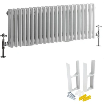 General description Effortlessly heat your room and add classic style with the Milano Windsor horizontal double column radiator, which includes matching floor-mounting feet. Featuring a traditional cast iron inspired design, this radiator is made from premium quality steel and is accentuated by an attractive white powder coated finish. A warm and inviting atmosphere can easily be created in your living space thanks to the impressive heat output. Technical specifications Type: Horizontal double column radiator Material: Steel Finish: White powder coated Heat output: 2642 BTUs (774 Watts) Dimensions: 300mm x 1010mm x 68mm Tested and certified to BS EN 442 standard ISO9001:2015 registered manufacturer Compatibility and accessories Includes blanking and bleed plug Includes fixings Matching floor-mounted feet for a coordinated look Other information This product is covered for 20 years