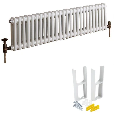 Effortlessly heat your room and add some classic style at the same time with the Milano Windsor horizontal double column radiator which includes matching floor-mounting feet. Featuring a traditional cast iron inspired design the radiator is made from premium quality steel and is accentuated by an attractive white powder coated finish. A warm and inviting atmosphere can easily be created in your living space thanks to the impressive heat output. - White cast iron style double column horizontal radiator - Steel construction with hard-wearing finish - Gives a heat output of 3122 BTUs (915 Watts) - Matching floor-mounted feet for a coordinated look - Tested and certified to BS EN 442 standard - ISO9001:2015 registered manufacturer - Includes blanking and bleed plug plus fixings - This product is covered for 20 years - Dimensions: 300mm x 1190mm x 68mm