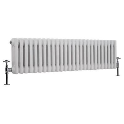 General description Enhance the feeling of warmth and comfort in your home with the Milano Windsor cast iron style triple column horizontal radiator. Boasting an attractive classic design, the radiator is made from premium quality steel and is accentuated by a timeless white powder-coated finish. The impressive heat output ensures that your living space will be quickly and efficiently heated to create a cozy ambiance. Technical specifications Dimensions: 300mm x 1190mm x 100mm Heat output: 2849 BTUs / 835 Watts (T50); 1467 BTUs / 437 Watts (T30) Construction material: Steel Finish: White powder-coated Tested and certified to BS EN 442 standard ISO9001:2015 registered manufacturer Compatibility and accessories Includes blanking and bleed plug plus fixings Radiator valves are required (not included) Other information This product is covered for 20 years