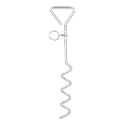 The Milestone 16 Camping Tie Out Stake is a durable, chrome-plated ground anchor with a corkscrew design for secure outdoor use. It features an arrowhead for easy insertion, a keyring for leash attachment, and is compact for convenient transport.
