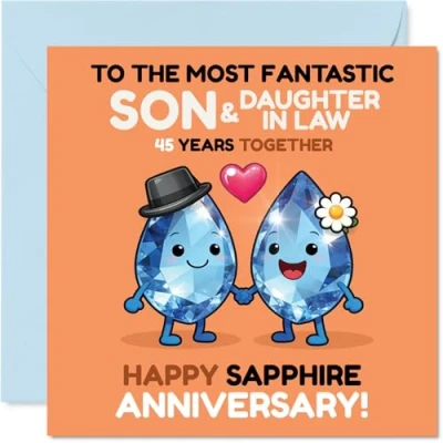 Milestone 45th Anniversary Card for Son & Daughter in Law Cheers to 45 Sparkling Years Cartoon Gem Couple Celebrating Sapphire 145mm Square, Envelope Included