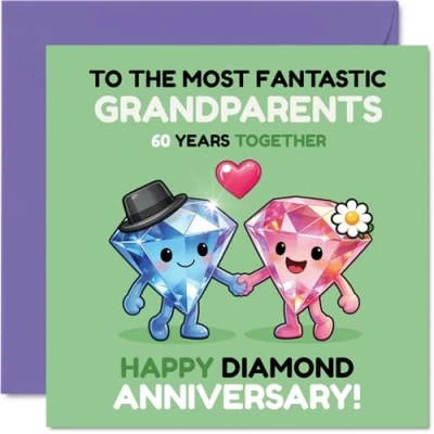 Milestone 60th Anniversary Card for Grandparents Sparkling Diamond Duo Celebrates 60 Years Colourful, Joyful Design with Cute Characters 145mm Square, Envelope Included