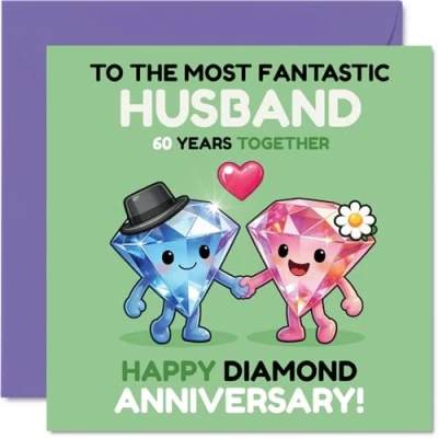 Perfect for marking a diamond anniversary, this card's cute diamond duo captures the joy and fun of 60 years together at a glance. Anniversary card for Husband with a light-hearted design style Features cheerful illustrations of two smiling diamond characters and bold, colourful lettering that's sure to stand out. Recyclable and printed in UK for a considerate choice Printed on quality single sided gloss board with an uncoated inside-no smudging when writing inside-plus eco-friendly and made in the UK. Printed on 360 micron stock for a confident, premium feel Inside message: Husband. Supplied with a matching envelope to complete your thoughtful gesture. The 145mm Square format is convenient to display or post Designed to make a milestone celebration extra special-delight your partner with a keepsake that's both playful and memorable. Printed in the UK