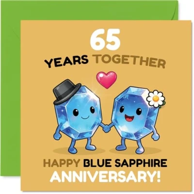 Brings a smile with its joyful illustration of two adorable gemstone characters holding hands, capturing the spirit of 65 wonderful years together Features a cheerful blue sapphire motif with playful pops of yellow and green, making it a stand-out choice for this milestone celebration. Recyclable and printed in UK for a considerate choice Printed on quality gloss single sided board with uncoated inside, so your message flows easily. Eco-friendly, recyclable, and made in the UK with FSC board for your own heartfelt words. Comes with a matching envelope, ready to send your best wishes. The 145mm Square format is convenient to display or post Count on a thoughtfully crafted card that suits anyone marking a 65th anniversary-ideal for parents, friends, or a special couple. Ideal for a mum or dad celebrating a milestone anniversary
