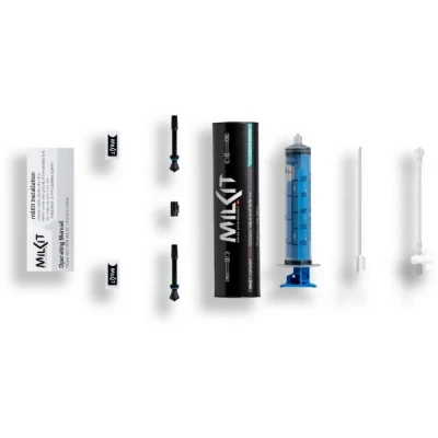 With the revolutionary milKit valve system, installation and maintenance of tubeless sealant becomes a breeze. The solution to combat sealant drying out or escaping! With other tubeless tire valve systems you need to remove the tire to check if enough sealant remains, with milKit you can simply remove the valve core and insert the syringe to check. No mess and faster results! The syringe holds 60ml or 2 oz of fluid and comes with a flexible connector and a large needle to push through the valve and rubber flaps. There’s also a sealant regulator that screws into the syringe for easy refilling. The needle has an angled end for effective removal of all sealant in the tire.Patented milKit presta bike valves are made in Germany from anodized high quality aluminium alloy and high performance rubber for the smart flaps.The standard milKit valves have a usable length of 35 mm (1 3/8 inch), and they work for most road and mountain bike rims except some special high-profile rims. For high-profile rims, there are 45mm, 55mm and 75mm versions of the milKit valves available.milKit valves can be used with most sealants, but we recommend milKit sealant. This has been specially designed for best results with these valves.Key Features:Quick measuring and refilling. The milKit valve system allows to check old and add new sealant without deflating the tire.No more valve clogging.The patented smart rubber flaps prevent the sealant from entering and blocking the valve.Easy and clean tubeless installation. No more mess as tires can be inflated dry and sealant added afterwards through the valve.Smart rubber flaps ensure no air is lost when the valve core is removed and sealant does not block the valvesUse the syringe to easily check if enough sealant remains in your tireThe syringe accurately measures the amount of sealant neededNo more mess as tires can be installed dry and sealant added afterwards through the valveKit contains measuring & refilling syringe, valves, and valve core removal tool2x 35, 45, 55 or 75mm milKit valves1x measuring and refilling syringe1x valve core tool2x milKit rim stickers