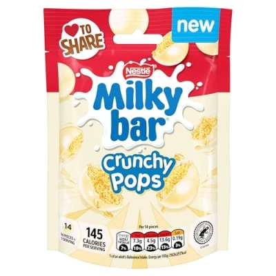 90g Sharing Bag of Milkybar Crunchy Pops Creamy white chocolate 'pops' with a crunchy, crispy centre, covered in Milkybar chocolate Perfect for sharing with family & friends No artificial colours, flavours or preservatives