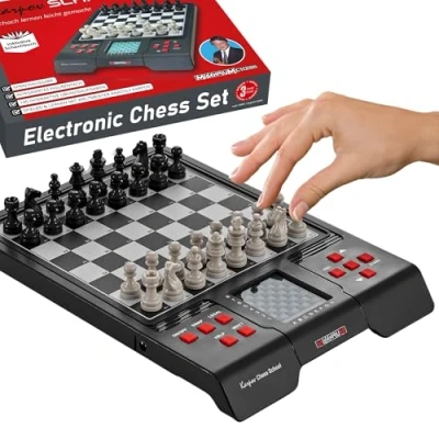 Learning chess made easy: 100 interactive exercises, a 196-page textbook and clever voice output guide children and adults safely through the world of chess. For children, families and schools: Exciting chess tasks with helpful tips - this is how children, parents and pupils learn chess together, explained in a motivating and understandable way. With voice output and help functions: Step-by-step explanations that point out mistakes, explain moves and help you to learn chess properly and with fun - in German or English. Ready to play chess anywhere - even on the go: With a piece compartment, battery operation and compact design - ideal for traveling, family evenings, school and clubs. Your chess trainer to take with you. High-quality chessboard & magnetic pieces: Smooth-running pressure sensor chessboard recognizes every move precisely. New, exclusive pieces ensure a great playing experience and a pleasant feel., Platforms: Windows