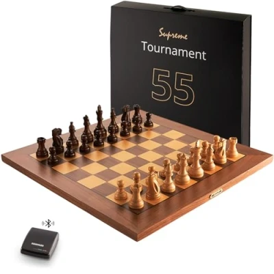 Finest wooden tournament chessboard - The Supreme Tournament E-Board (55 x 55 cm) offers real chess fun with hand-crafted, heavy wooden pieces in American Staunton style (king height: 95 mm) Natural feel - Thanks to ultra-fast RFID technology, the board automatically recognizes every move - move the pieces naturally without applying pressure, 81 invisibly integrated LEDs clearly and discreetly display the moves of your opponent or the computer Online and offline play options - with the included ChessLink module, you can easily connect the board to your smartphone, tablet or PC, Play online against players from all over the world on chess and Lichess - or offline with numerous chess programs such as Hiarcs, Fritz, Chessbase and many more Expandable and Modular - Combine the Supreme Tournament 55 with other Millennium chess computer modules such as the Chess Classics Element or the powerful Mephisto Phoenix, The optional ChessVolt supplies the board with power when there is no power socket nearby Ideal storage and transportation - Supplied in an elegant premium storage box with space for pieces, ChessLink module and accessories, Thanks to the integrated handle, the box is also Ideal for transportation, Manufacturer: Millennium