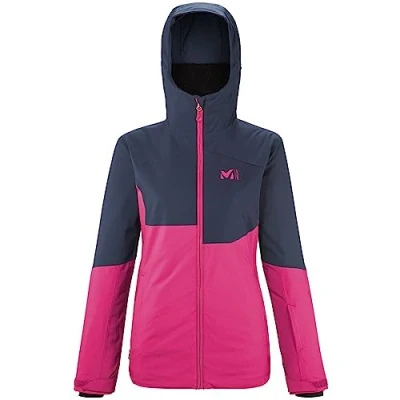Waterproof and breathable DRYEDGE membrane with 2-way stretch fabric, Zipped underarm ventilation. 2 zipped hand pockets with warm micro-fleece inside, 1 inside mesh pocket for mask, 1 inside zipped pocket, 1 zipped pocket at bottom of sleeve for passport, Central zipped opening Snow skirt and adjoining adjustable hood Stretch cuffs with tightening at hem and cuffs Content: Millet Nallo women's protective jacket, Weight: 272 g, Size : S, Colour: Blue and Pink
