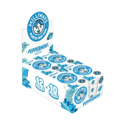 Milliways Peppermint Chewing Gum, Plastic Free, Sugar Aspartame Natural 12 Packs of 10 Pieces (120 Total) Xylitol, Plant Based, Biodegradable