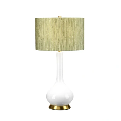 Milo table lamp with ceramic base and fabric lampshade The Milo table lamp adds a colourful accent to the room. Its base is made of glossy white ceramic with a decorative metal ring at the bottom, while the cylindrical lampshade is made of fabric with a beautiful structure and pattern. The light is switched on and off using the switch integrated into the cable
