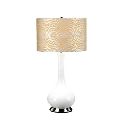 Milo table lamp with ceramic base and fabric lampshade The Milo table lamp adds a colourful accent to the room. Its base is made of glossy white ceramic with a decorative metal ring at the bottom, while the cylindrical lampshade is made of fabric with a beautiful structure and pattern. The light is switched on and off using the switch integrated into the cable