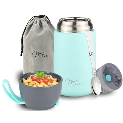 TOP INSULATION: Thanks to the double-walled vacuum insulation, your favourite food stays warm for up to 9 hours or cool for up to 16 hours! Do away with cumbersome cool bags and save yourself the hassle of tedious ready-made meals. Enjoy your healthy food everywhere. COMFORT: Large opening for easier filling! Baby bottles can also be heated on the go. Easy cleaning saves your nerves. The outer lid is useful and can be used as a bowl on outings. FUNCTIONALITY: Easy opening due to pressure release valve. Schoolchildren are happy when everything works effortlessly. Non-slip base ensures safe standing and sealing ring for dry transport in bags. 100 % leak-proof. EXCELLENT QUALITY: We use high quality and 18/8 stainless steel, which is free of any harmful substances, odorless and tasteless. Absolutely health safe! Because it is the best alternativ of plastic, you protect our environment. EXTRAS: Folding spoon is integrated to save space. Coloured rubber loops for better transport and individual differentiation, e.g. for family tours. Transport bag for protection against scratches and long enjoyment., Weight: 1.2015193279 Pounds, Manufacturer: Milu