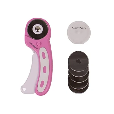 Milward 45mm Rotary Cutter & 5 Spare Blades, Ergonomic Handle with Safety Lock, Left Right Handed Fabric, Leather, Crafting, Sewing, Quilting, Fabric Cutter, Pink White