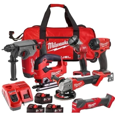 Milwaukee M18FPP6L3-503B 18v 6pc Fuel Power Pack - 3 x 5.0ah Batteries M18FID3 Fuel Impact Driver M18FMT Fuel Multi Tool M18FJS Fuel Top Handle Jigsaw M18TLED LED Torch M18FSAG Fuel Grinder M18FH Fuel SDS Plus Hammer Drill M18B5 x 3 5ah Batteries Fast Charger Tool Bag This impressive 6 Piece Power Tool kit from Milwaukee brings you a quality range of heavy-duty cordless power tools ideal for professional use. The kit includes 3 batteries & a fast-charge charger so you will never be worried about waiting for a battery to charge., Weight: 13.889122506 pounds, Manufacturer: Milwaukee