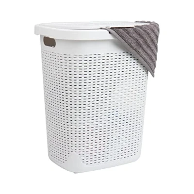Spacious storage capacity: This durable plastic clothes hamper can hold up to 50 liters (15kg/33lbs) of laundry, providing ample space to keep your clothes organized Easy portability: The built-in cut-out handles make it convenient to transport the hamper to the laundry room or laundromat without straining your hands Neat and tidy: The hinged lid allows you to keep your laundry concealed, ensuring a clean and organized bathroom or bedroom Optimal ventilation: The lightweight premium wicker design promotes air circulation, preventing odors and keeping your clothes and towels fresh Compact yet roomy: Measuring 17.65 inches long x 13.75 inches wide x 21 inches tall (44.83 x 34.92 x 53.34 centimeters) at the top, this 4-lb. tapered clothes hamper fits perfectly into small spaces while still providing ample storage capacity