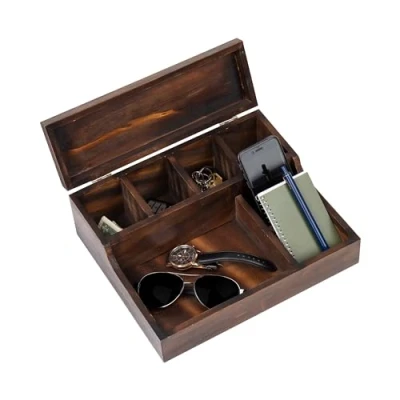 Organize with ease: This versatile valet tray features 7 compartments to neatly store and organize a variety of items such as cell phones, keys, sunglasses, wallets, jewelry, and watches Flexible placement: Whether placed on a console table, nightstand, or bathroom vanity, this valet tray offers practical storage and can be used in various rooms according to your needs Elegant design: With its natural wood construction and vintage-inspired design, this valet tray adds a touch of style and sophistication to your space while keeping your items organized Durable and easy to maintain: The hinged lid of this tray protects small items from dust, and the sturdy wood construction ensures long-lasting use. Cleaning is a breeze with a dusting cloth or wet wipe Dimensions: Measuring 10 inches long x 12 inches wide x 4 inches tall (25.4 x 30.48 x 10.16 cm), this valet tray offers ample storage space while maintaining a compact and convenient size