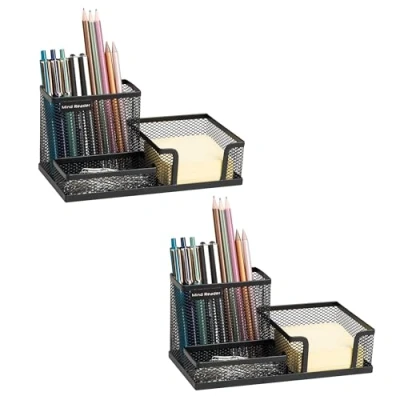 NEAT AND ORGANIZED: Keep your office desk organized and presentable. This desk organizer is equipped with 3 compartments that can be used as a pencil holder, pen cup, paperclip tray, and sticky note holder for your desk. DURABLE: Made with a black mesh construction, this product is hard to bend or break. This office desk organizer will house your stationary cubicle accessories for years to come! LIGHTWEIGHT AND PORTABLE: No installation required. Easy to pick up and move when switching desks making it ideal for open office and hot desk environments. 2 PIECE SET: Do you have a work buddy you’d like to show some appreciation to? How about a gift idea to get on the good side of your boss? This two-piece set means you can gift one to a co-worker and keep one for yourself! DIMENSIONS: 3.5 (L) x 7 (W) x 3.75 (H) inches
