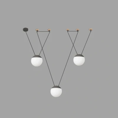 This eye-catching fixture boasts a dark grey finish complemented by wooden accents, creating a stylish contrast that works seamlessly in various decor styles. Each small globe is available in two finishes—white or grey—and features an opal glass diffuser that ensures soft, diffuse light while minimizing glare. The globes are suspended elegantly from a robust wooden hook, allowing them to illuminate the surroundings in all directions. This design innovation not only adds character to any room but also serves as a conversation starter.