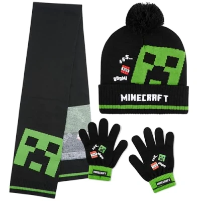 Minecraft Beanie Winter Accessories Set Boys Teens, 3pcs Hat Scarf Gloves or 2pcs & Hat, Warm Knit, Gifts (6 14 Years, Black Minecraft)
