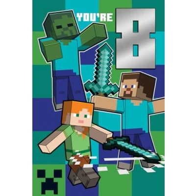 Minecraft 8th birthday card featuring iconic game artwork and a fun sticker for added excitement. Tailored to bring a smile by Europe's leading publisher of Licensed Greetings Cards Arrives with a suitably sized envelope for your convenience Perfect addition to any birthday gift or birthday party, adding a unique and personal touch Thoughtfully designed birthday card featuring eye-catching artwork and a celebratory message, ideal for making their special day even more memorable.