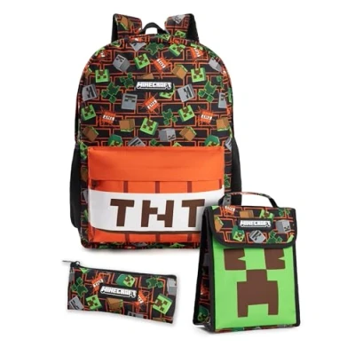 Minecraft Creeper & TNT Unisex Kids Multicoloured 3 Piece Backpack Set Zipper Hook Closure Carry School Supplies Back to Essentials Merch