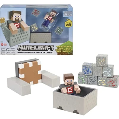 Minecart Mayhem is a blast of Minecraft action in the real world Steve figure fits in the minecart With a push of the launcher, send the cart flying into a wall of papercraft blocks Includingudes minecart and exclusive Steve figure in 325Inch scale And Steve has moving joints for big-action poses Also comes with eight papercraft blocks that kids will put together and use to create their own terrains Minecraft fans will appreciate the authentic design details that stay true to the unique, pixelated world of the famous video-game, Manufacturer: Mattel
