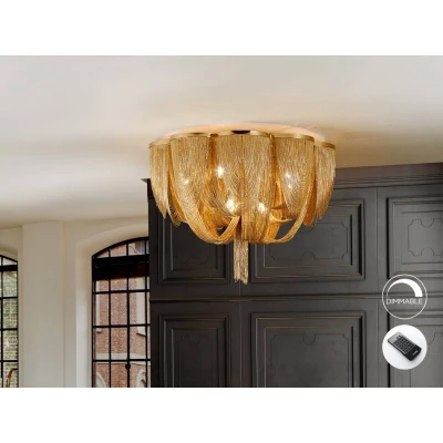 Ceiling lamp of 10 lights, composed by fine metal chains in nickel finish forming the body of the lamp. DIMMABLE. Remote control included.