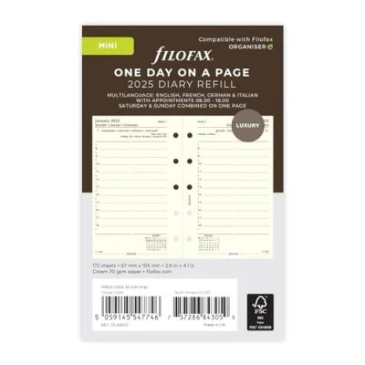 Filofax Mini 2025 diary refill Day per page format English, French, German and Italian Cotton cream paper Paper size 67mm x 105mm