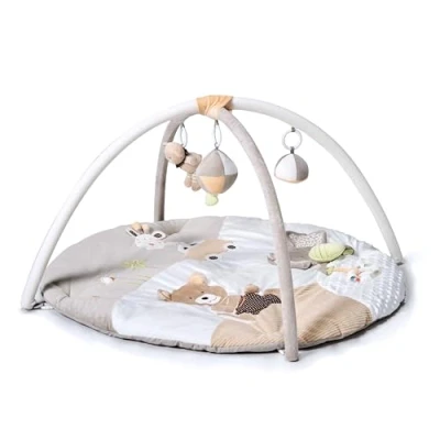 THICK AND SOFT MATERIAL: The luxurious polyester lining and cotton padding of this soft floor gym play an important role in protecting your babies in the process of learning to stand and play. Parents can also enjoy a comfortable and safe playtime with their children with this activity gym DETACHABLE TOYS: This play gym for toddlers includes 3 detachable hanging toys with can hang on the car seat, buggies, pushchairs and strollers. The toys are specifically designed for tactile and gripping experiences to develop fine motor skills. Also comes with a baby mirror, squeaker, a crinkle, a teething ring and grosgrain grippy ribbons BEAUTIFULLY DESIGNED: Other play gyms fall into the trap of being too busy in terms of colour and design. Our baby play gym is tastefully designed to fit in perfectly with the decor of your home. The play gym is easy to set up and can be assembled in 20 seconds. It also comes with a carry case for easy transportation SAFETY FIRST: Here at MiniDream, your babies safety is our number one priority. Therefore, the baby play gym Complies with EN71 regulations and has an anti-slip surface for your little one's protection. The baby mat contains non-toxic materials for your peace of mind STIMULATES YOUR BABY’S SENSES - This gym mat for boys and girls is designed with multiple activities for sensory perception development! Smart colours are included to enhance visual skills. Playful fun tunes, music and textures stimulate baby's senses of hearing and touch