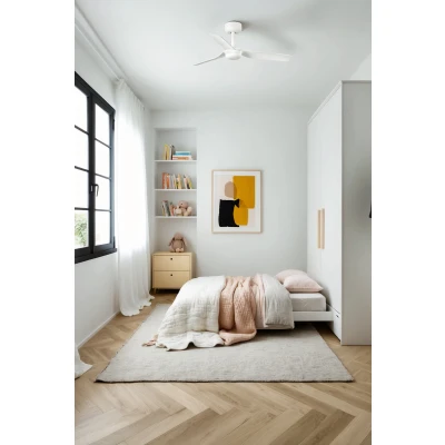 Net LightingMINI PUNT S is a white ceiling fan with white blades, ideal for rooms smaller than 13 m². Operated by remote control with programmer, included. This ceiling fan with energy-saving DC motor has 6 adjustable speeds, summer-winter reverse function and is suitable for sloping ceilings.