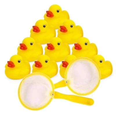Mini Rubber Ducks 10 with 2 Fishing Net Bath Toy Set Fun Water Games for Kids, Perfect Summer Paddling Pools and Baby Showers