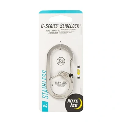 This slide-to-lock carabiner allows users to clip keys and gear into the first chamber for easy access, then transfer through the inner gate to the second chamber for secure storage Dual chambers + SlideLock outer gate Stainless steel body Stainless steel gates Individually weight rated