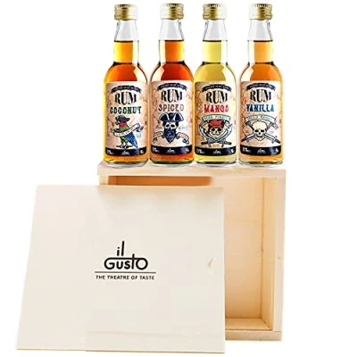 Four Flavors in One Box: Our Miniature Rum Gift Set brings a symphony of tastes to your palate. Each set includes four exquisite flavors, allowing you to embark on a voyage of flavors right from your glass. Inside, you'll find: Coconut Rum: Transport yourself to a tropical paradise with the rich, creamy coconut infusion of our Coconut Rum. Perfect for sipping neat, on the rocks, or as the key ingredient in your favorite cocktails. Spiced Rum: A warm and tantalizing blend of spices creates the perfect balance in our Spiced Rum. It's the ideal choice for those who love a hint of warmth and complexity in their drinks. Mango Rum: Dive into the luscious and exotic world of Mango Rum. This tropical infusion adds a delightful fruity twist to your cocktails, making it an instant crowd-pleaser. Vanilla Rum: The smooth and sweet embrace of Vanilla Rum is a dessert lover's dream. Its velvety vanilla notes transform your ordinary drinks into something truly extraordinary. Perfect for Any Occasion: Whether you're attending a Secret Santa event, looking for Christmas party favors, or searching for a heartfelt Father's Day gift, this Miniature Rum Gift Set fits the bill. It's a thoughtful present that captures the essence of celebration. Convenient Miniature Bottles: Each bottle is perfectly sized at 40 ml, making it a convenient option for enjoying your favorite rums without the need for a full-sized bottle. Plus, they are travel-friendly, allowing you to take your flavors wherever your adventures lead. Crafted for Flavor Enthusiasts: This set is curated for those who appreciate the art of fine rum. Whether you're a seasoned connoisseur or new to the world of rum, our Miniature Rum Gift Set promises an exceptional tasting experience.