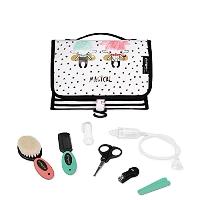 AmazonEssential care kit with 7 hygiene products: silicone gum brush, nasal aspirator, comb, natural bristle brush, scissors, nail clippers and 4 file nails Bag with waterproof interior Comfortable hook for hanging anywhere