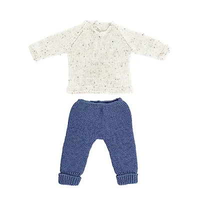 Miniland Set of jersey and trousers beige and blue recycled knitted for doll 40 cm. Made in Spain with quality recycled textile to reduce the environmental impact. Compatible with Miniland Dolls 40cm Dolls Suitable for children from 36 months. Miniland Dolls Collection. Encourages equality, inclusion and diversity from children., Manufacturer: Miniland
