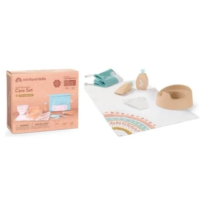 Wooden accessories Miniland Dolls hygiene set. Fabric bag with potty, diaper, soap pad, moisturiser bottle and changing mat. Made from timber sourced from sustainable forests Great for expanding the game with Miniland Dolls, Manufacturer: Miniland