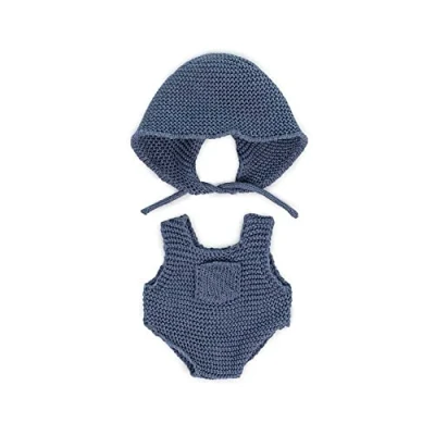 Most beautful and sustainable too! Your Miniland Dolls will be on trend with this beautiful outfit made with recycled materials. Knitted Rompers & Hood in blue Suitable for 21cm Miniland Dolls, Manufacturer: MINILAND