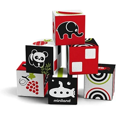 6 soft cubes with stimulating colors and patterns Spongy texture Dimensions 7x7 cm Model number: 97313, Manufacturer: Miniland