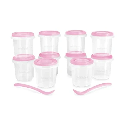 Set of 10 airtight containers of 250ml graduated to calculate the ideal quantities Made in Spain wiith exceptional quality and BPA Free For all types of solid foods or liquids (ideal for breast milk) For heating up anywhere (warmers, microwave or bain-marie) and suitable for freezer Including 2 training spoons (a softer one for starting on solid food and another with more capacity)
