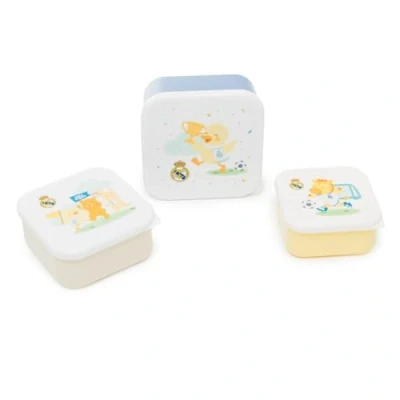 Set of 3 Stackable Solid Food Boxes: Includes 230ml, 350ml and 540ml lunch boxes, perfect for taking fruit, snacks or snacks on the go. 【SUITABLE FOR 0-5 YEARS OLD BABIES & KIDS】Ideal size for toddler school, outing to the park or visiting grandparents' house. 【Safe & BPA Free Material】Made of food-grade polypropylene, free of BPA and harmful substances for safe eating. 【Easy to Clean & Stack】Sturdy, lightweight and dishwasher safe (top rack). Stores inside each other to save space. Real Madrid Collection: Each box has a different design with the official club crest and colors. Combine them with the matching backpack and bottle.