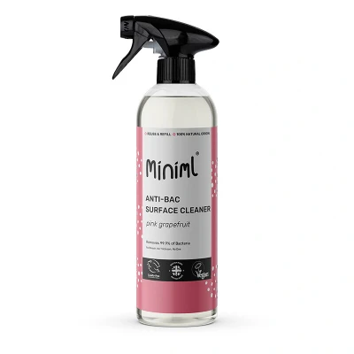 Miniml Anti-Bac Surface Cleaner - Pink Grapefruit 750ML is a plant-based, antibacterial all-purpose cleaner that removes 99.9% of bacteria and germs, leaves a fresh grapefruit scent, and is biodegradable, allergy-friendly, and refillable for zero waste. Safe for use throughout the home, it promotes sustainable cleaning.