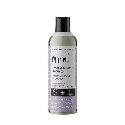 Miniml Nourish&Repair Shampoo with lavender and chamomile gently cleanses and strengthens dry, damaged hair while reducing split ends. Suitable for all hair types, it’s sulfate-free, vegan, and eco-friendly—perfect for daily use on sensitive scalps.