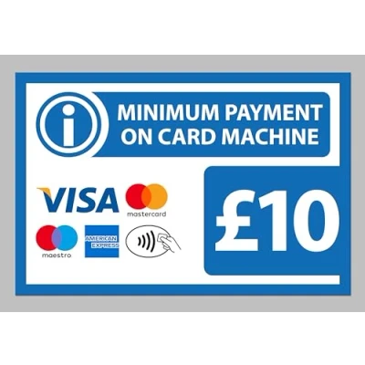 Minimum payment on card machine £10, blue sign. 1mm flexible Plastic sign. Digitally printed for extra durability. Drill and screw in position or use double sided tape to mount onto suitable surface. All signs come with a 5-year warranty. All our signs are UV resistant meaning they will not fade in sunlight. Suitable for indoor & outdoor use.
